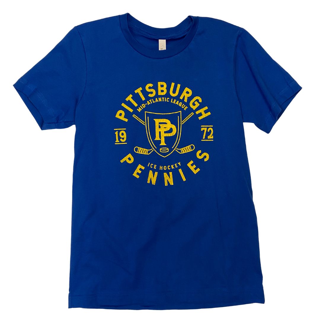 Classic crew neck, short sleeve T-shirt featuring the Pittsburgh Pennies ice hockey team logo.