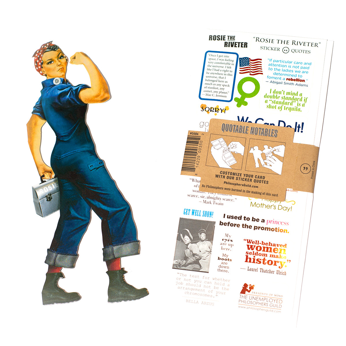Inspired by J. Howard Miller’s poster of a ready-for-anything Rosie comes with a sticker sheet of greetings ("Happy Birthday!") and good wishes ("Happy Mother’s Day!"), as well as inspiring quotes and image.