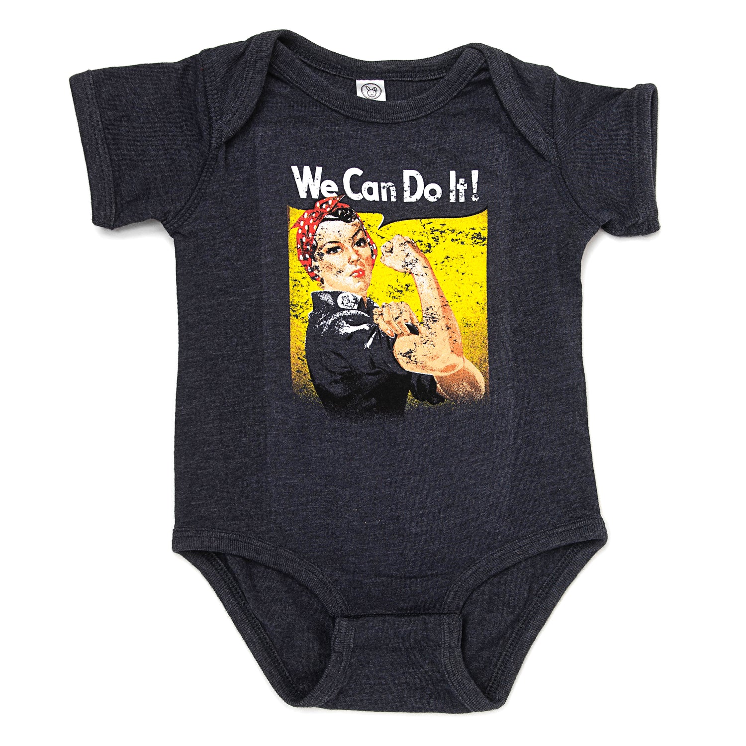Instill the "can do" spirit right from the start. Heather navy onesies featuring Rosie the Riveter, available in 6M, 12M, 18M, and 24M.